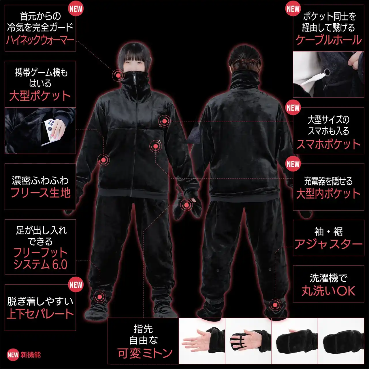 「ちょっとコンビニへ」を可能にする、待望の上下セパレートモデル。大容量のモバイルバッテリーを収納できる内ポケットと、そこから直接スマホへ給電できる「ポケットネットワークシステム」を搭載。位置情報ゲームや寝ながらのスマホ操作に最適な、現代ゲーマーのための戦闘服です。 |