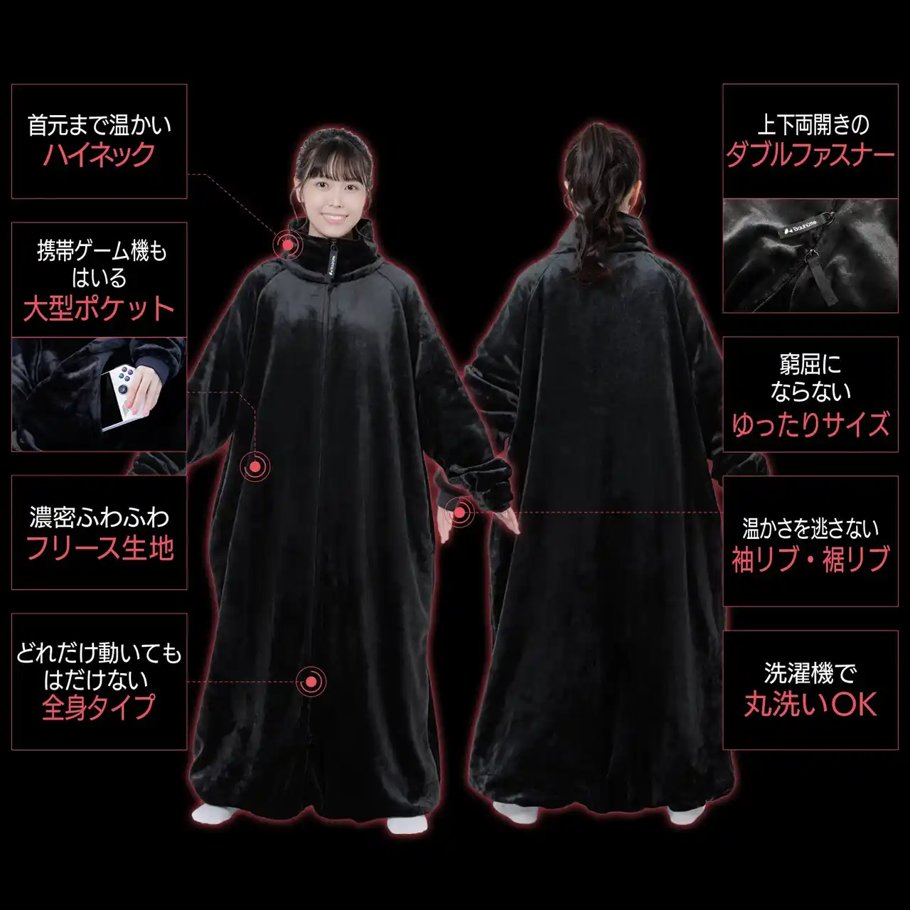 「着る毛布は寝ている間にはだけて寒い」という不満を解消。足元から首元までしっかり閉まるロングファスナーと、手足のリブが冷気の侵入を徹底シャットアウトします。ペンギンのようなゆったりシルエットで、一晩中ぬくもりをキープします。 |