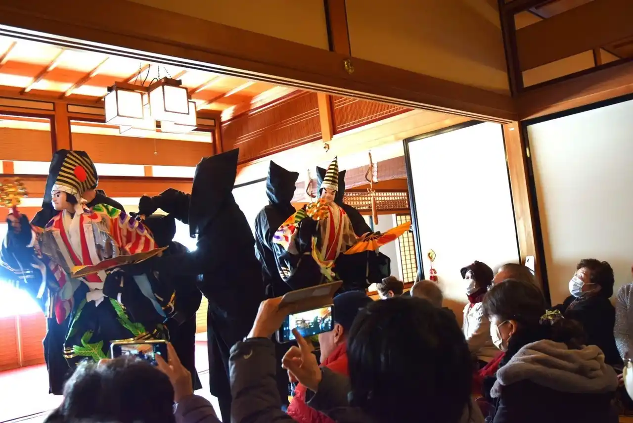 令和8年1月4日(日)には、吉田文楽保存会による人形浄瑠璃の上演を本陣書院棟で開催します。当日は、お正月にあわせ『二人三番叟 (ににんさんばそう)』という五穀豊穣や世の中の平和を祈る大変おめでたい演目を上演します。同会は、400年ほど前から受け継がれる飽海人形浄瑠璃の保存団体として市無形民俗文化財の指定を受けており、毎年11月に市内で舞台公演を行っていますが、今回は上演を間近で見られる、またとない機会です。 |