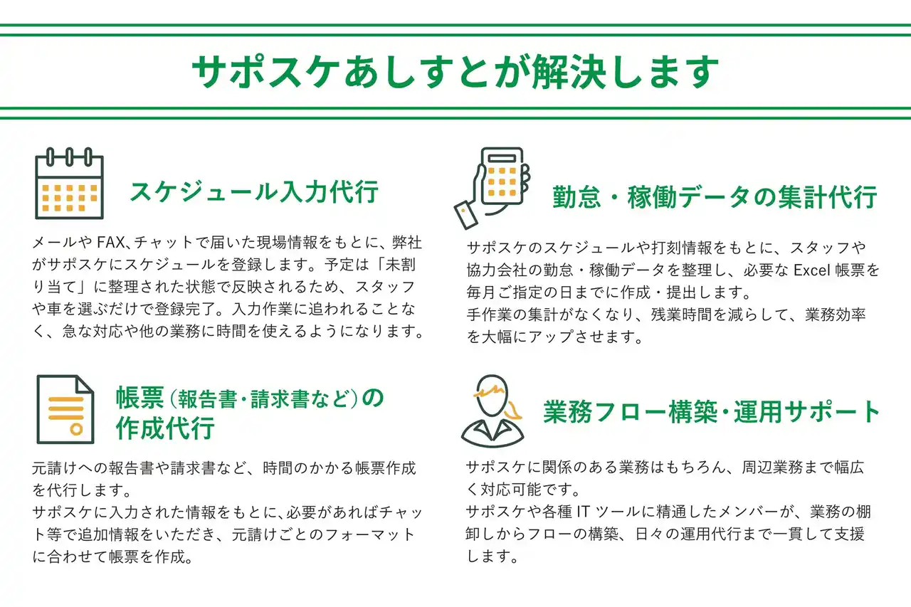 ● スケジュール入力代行: メールやFAXで届く案件情報をサポスケへ代理登録 。 |