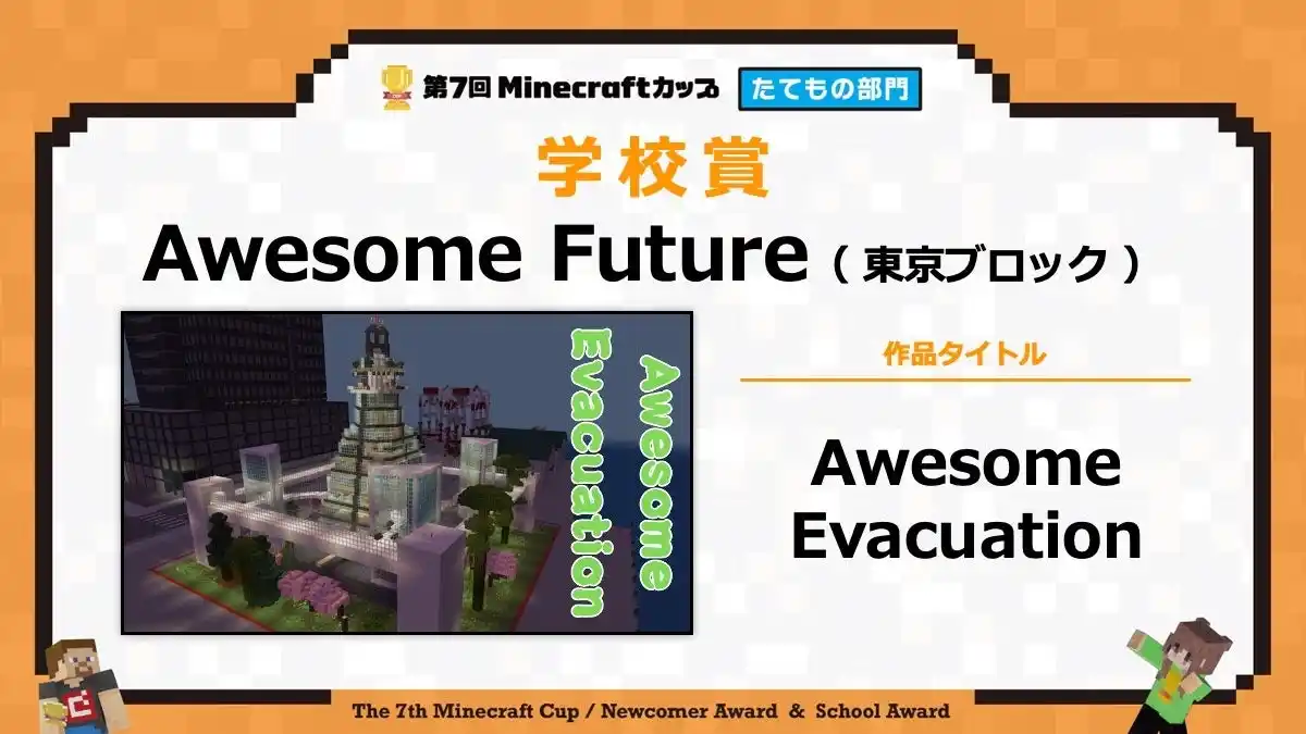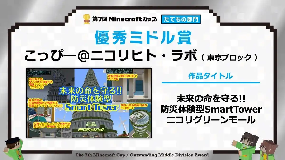 | たてもの部門の表彰式は、2月15日に東京大学で行われる「第7回Minecraftカップ まちづくり部門全国大会・表彰式」と合わせて行います。さらに、最優秀賞、優秀ミドル賞、優秀ジュニア賞に輝いた上位3チームは、作品発表を行います。 | |||||||||||