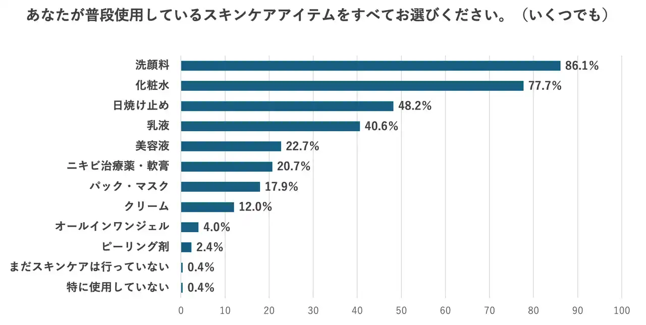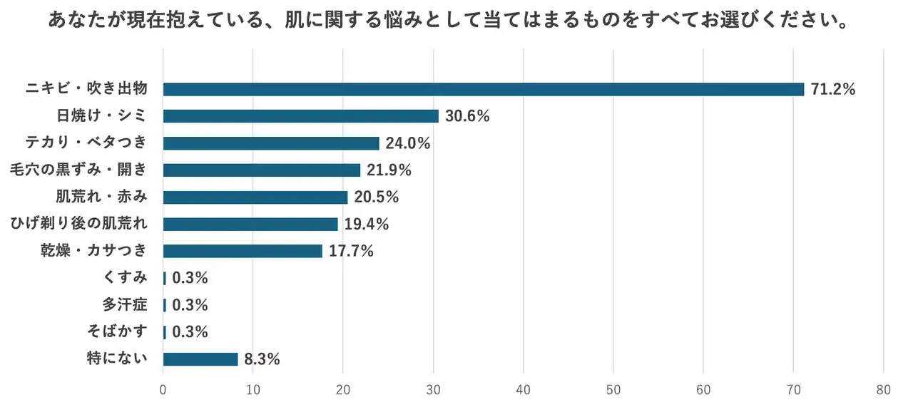 ・最も多い肌悩みは「ニキビ・吹き出物」で7割を超える結果となり、思春期特有の悩みが圧倒的に多いことが明らかになりました。また、屋外での活動が多い年代であることを背景に「日焼け・シミ」が3割を超え、「テカリ・ベタつき」や「毛穴の黒ずみ・開き」など、皮脂分泌に関わる悩みも2割前後と続いています。 |