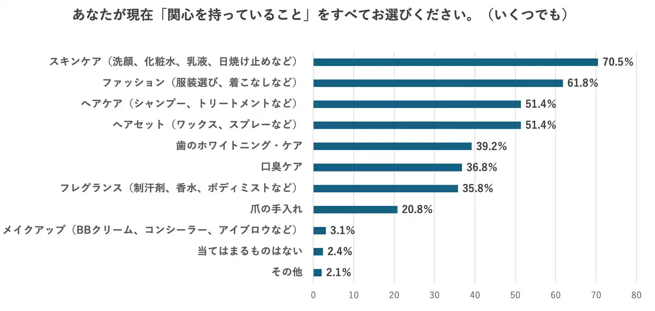 ・美容は日常化──8割が関心、中学生からスタートが主流 「美容について関心がある」と答えた中高生男子は8割を超え、スキンケア実施率は7割にのぼりました。また、半数以上が中学生からスキンケアを始めており、学校や部活といった生活文脈を起点に、若年層においても男性の美容が“身だしなみ”や“コンディション管理”として日常に根付き始めていることがうかがえます。 |