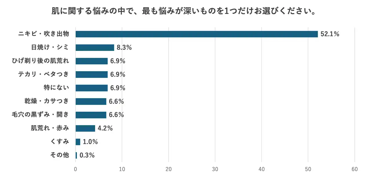 ・肌悩みは思春期特有のニキビが圧倒的多数。半数以上が「今もっとも深刻」と回答