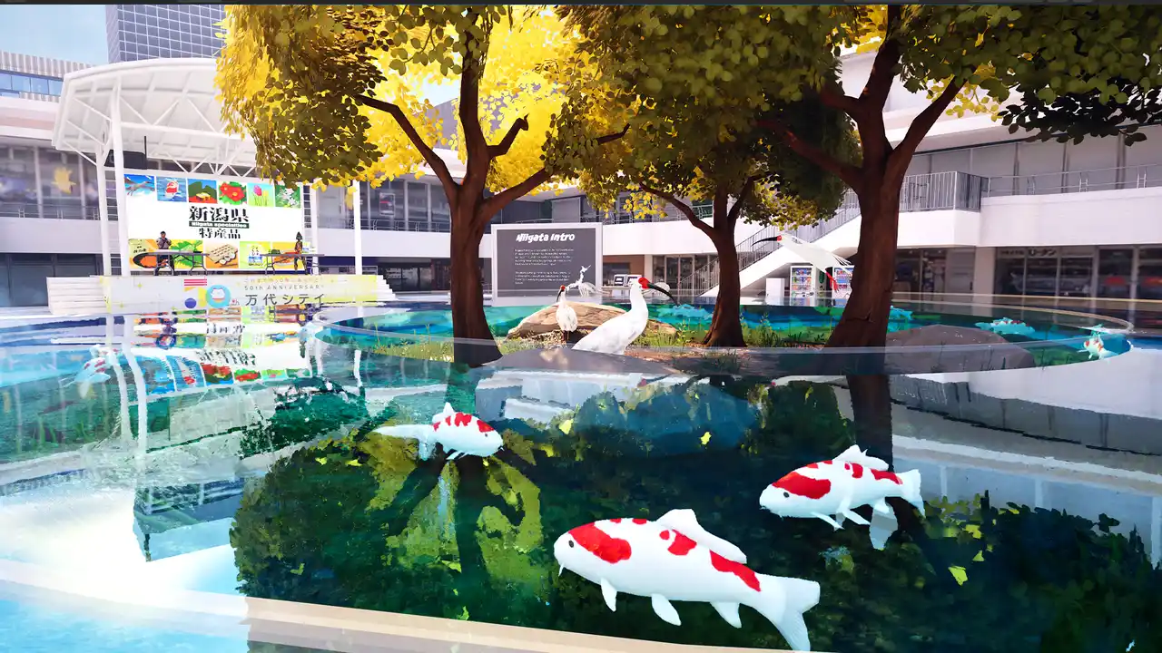 本作は、PLATEAUが提供する3D都市モデルをもとに、リアルとゲームが融合したビルドバトルゲームです。街並みをロビーエリアとして再現し、プレイヤーは信濃川河口のランドマークを拠点に世界中のユーザーと建築バトルを行います。ロビーエリアには「トキ」「錦鯉」をシンボルとして配置し、笹団子・へぎそば・柿の種・佐渡金山の金などの特産品をデジタル展示しています。地域文化を自然に学べる構造になっています。 |