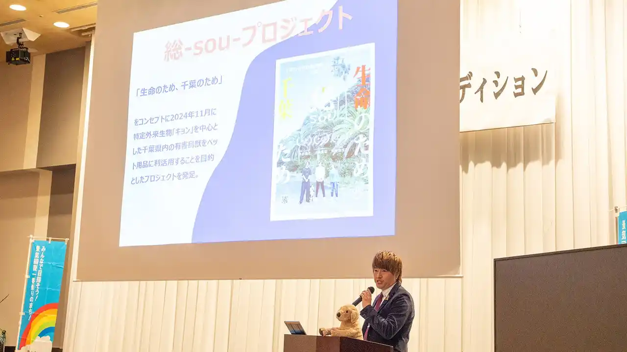 準グランプリには、ペット用品開発を手がけるunodue株式会社の小坂邊信さんが選ばれました。千葉県内で問題となっている特定外来生物「キョン」をペットフードにする事業を起点に、全国の特定外来生物をペットフードにする野心的な事業プランを提案し、生物の命をつなげつつ獣害を減らす内容に関心が集まりました。 |
