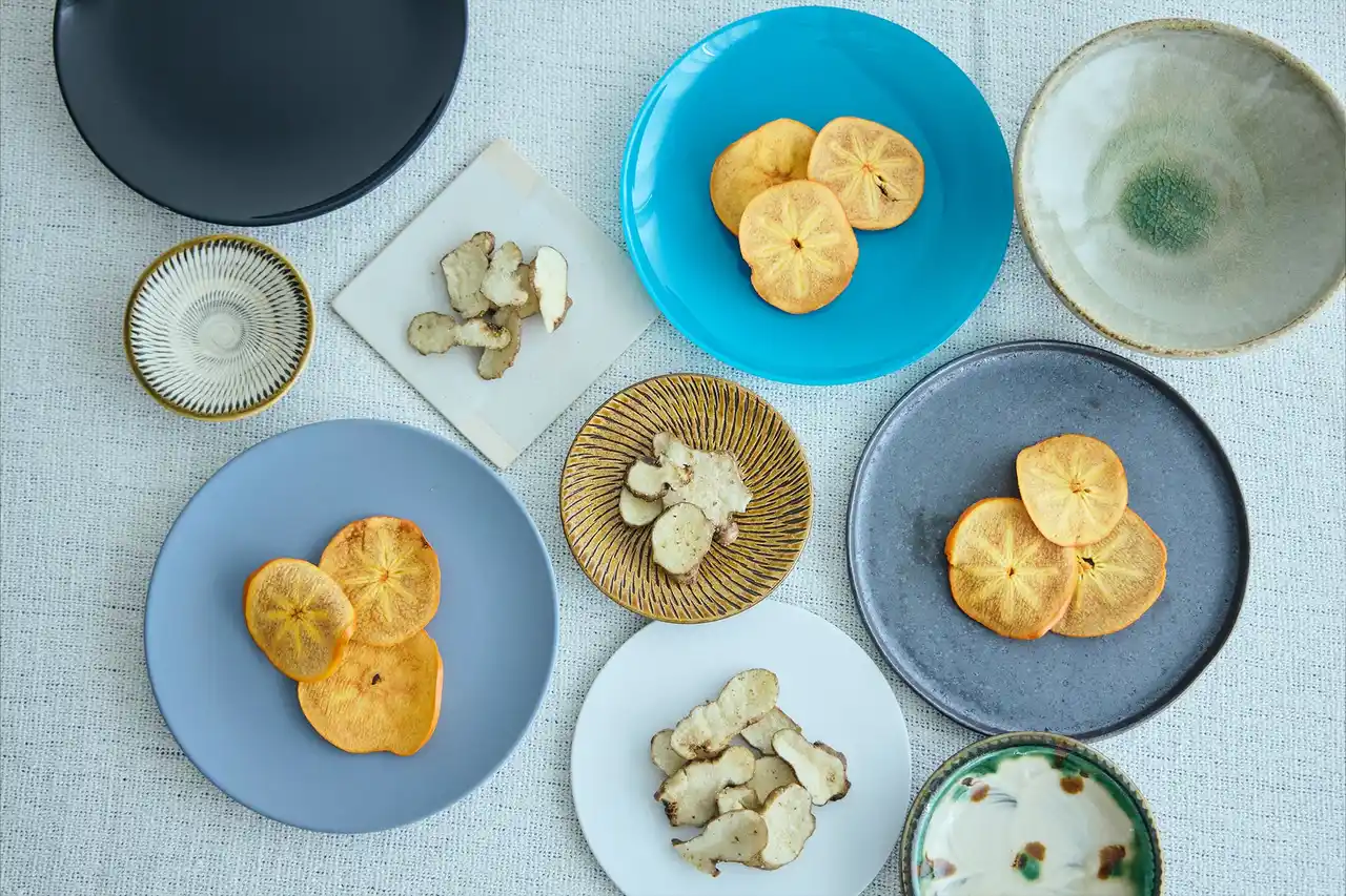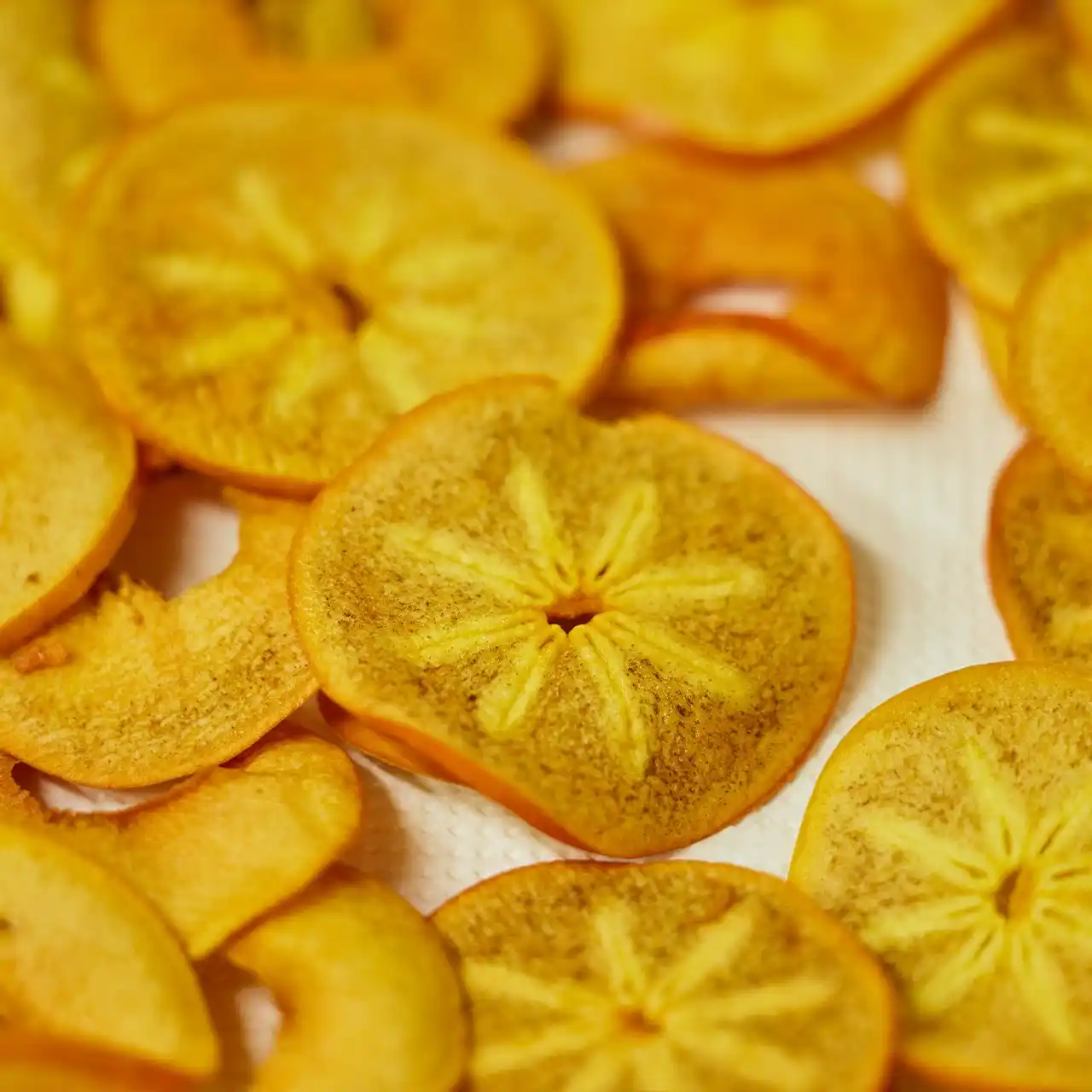 やまと果らり「富有柿チップス」は、柿本来の鮮やかな色味とお花のような可愛い模様が特徴的 |