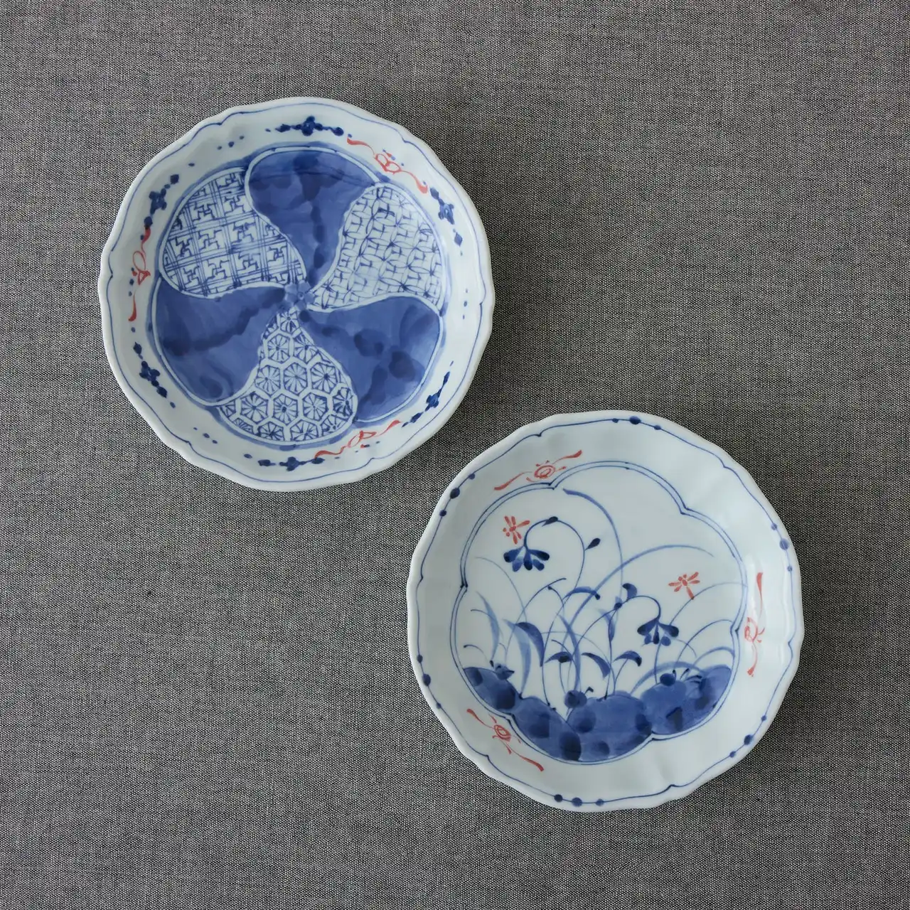 花のように波打つ縁を持つプレートで、幸福や繁栄を象徴する高麗草花や梅祥瑞の縁起柄と赤絵のポイントが食卓を華やかに彩り、縁が立ち上がった使いやすい形状で取り皿として毎日の食卓にぴったりなサイズです。 |