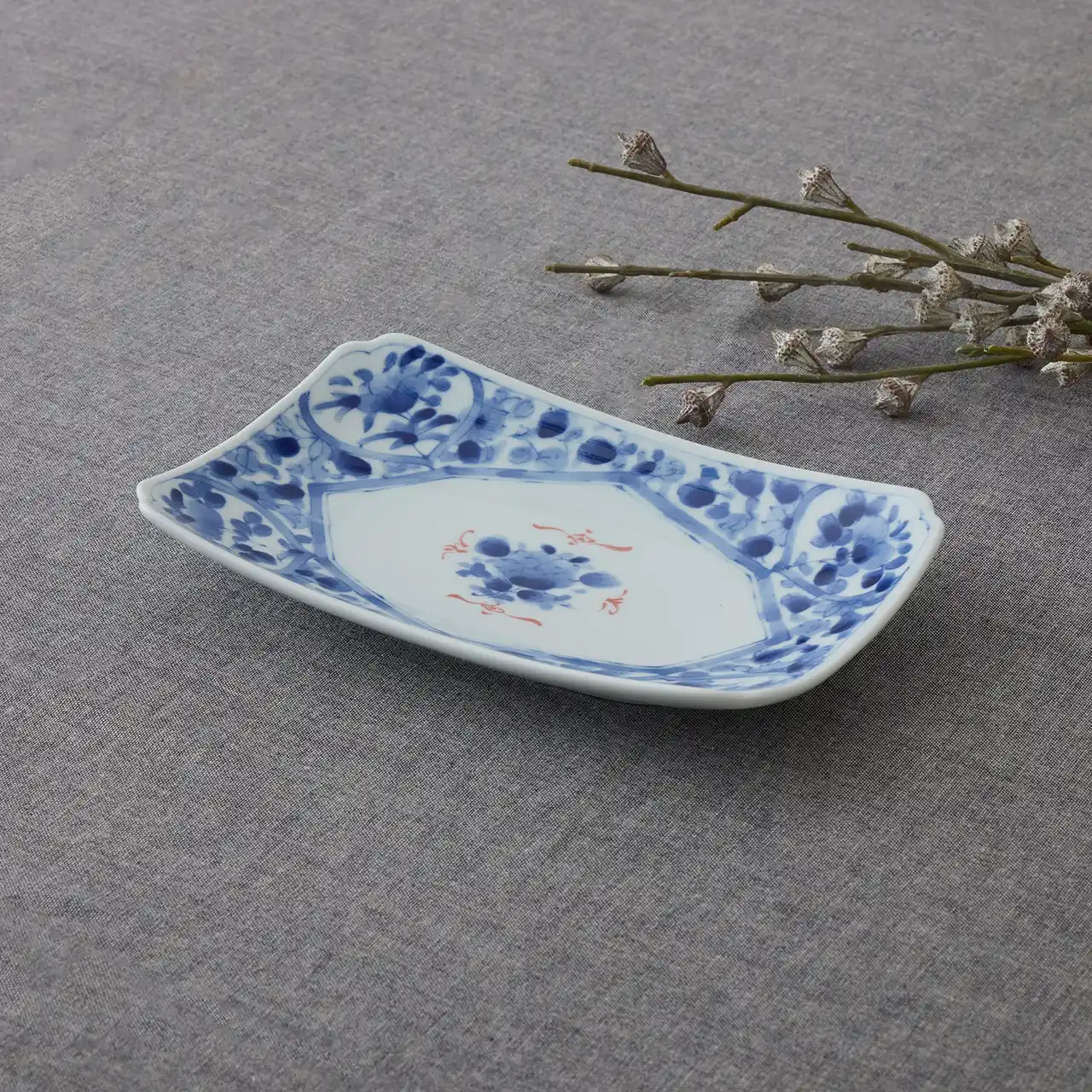 四隅にアクセントのある長角皿で、古伊万里をイメージした華やかな間取小花柄が施され、縁が立ち上がった使いやすい形状で、取り皿として毎日の食卓に彩りを添えるサイズです。 |
