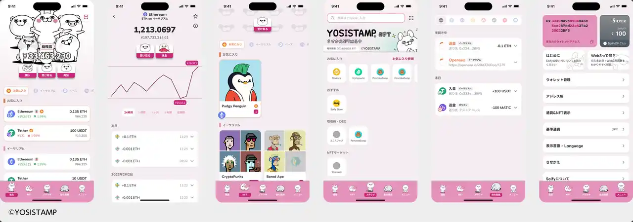 「Saify」は、「暗号資産をより身近に、楽しく」をコンセプトに、従来のウォレットアプリの枠を超えた体験を提供しております。 先日のきせかえNFT第1弾の販売以降、ウォレット画面を自分好みにカスタマイズできる新しい体験が、多くのユーザー様から大変ご好評をいただいております。 さらなる楽しさを提供するべく、今回は第2弾として、シュールだけど憎めないキャラクターたちがSNS等で幅広い層から愛されているクリエイター・ヨッシースタンプのきせかえNFTを販売いたします。ウォレットアプリを使うのが思わず楽しくなるようなデザインで、暗号資産に馴染みのない方にも身近に感じていただける世界観に仕上げました。 |