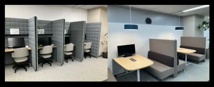 業務に集中する執務スペースと、社員間の交流や新しいアイデアを生み出すリフレッシュエリアを設置しました。執務スペース内には半個室のボックス席やソファー席など、様々な業務シーンに適した座席を設けています。リフレッシュエリアにはコーヒーマシンや福利厚生の冷食サービスを設置し、部署や役職に関係なく、横断的なコミュニケーションを促すように設計しています。 |