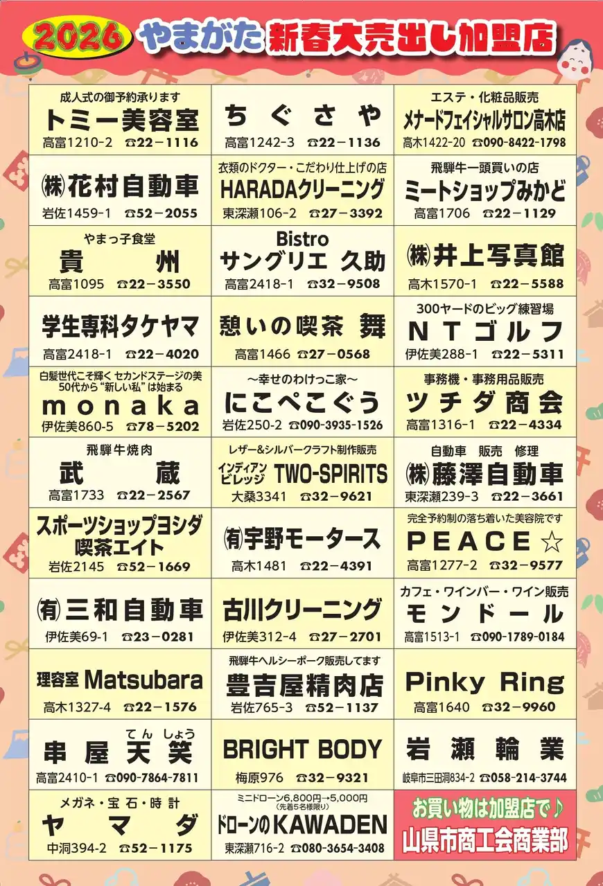 | 山県市商工会 商業部会(部長 吉井数忠)は、物価高騰の影響を受けている山県市の商店と消費者の皆さまを応援するため、市内合同イベント『やまがた新春大売出し』を実施します! | |||