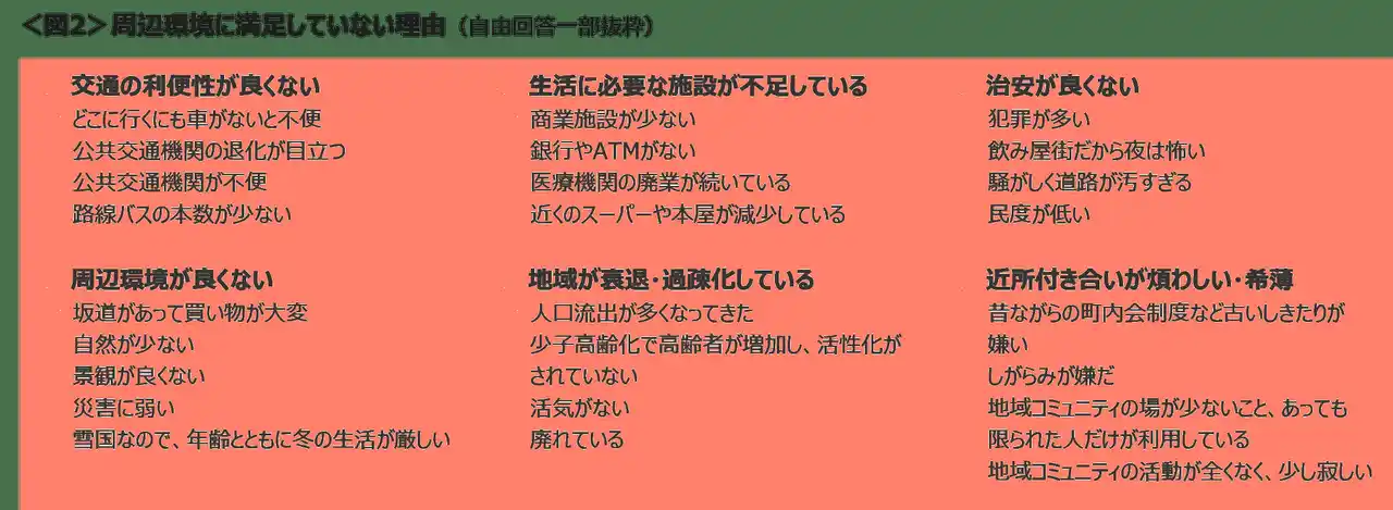 周辺環境への不満は、交通の利便性や治安が良くない、生活に必要な施設が不足している、地域が衰退・過疎化している、近所付き合いが煩わしい・希薄という声があがった。<図2> |