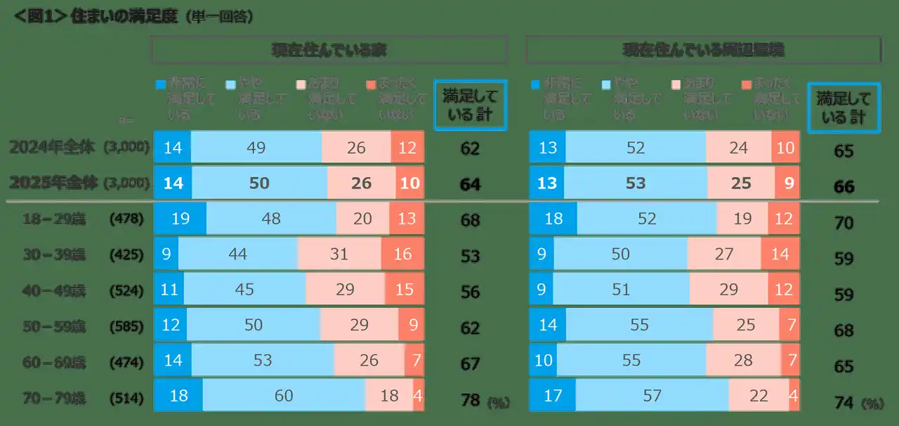 現在住んでいる家に対しては、非常に+やや満足しているは64%、周辺環境は66%。家と周辺環境ともに30~40代は5割台にとどまり、70代は7割を超える。<図1> |