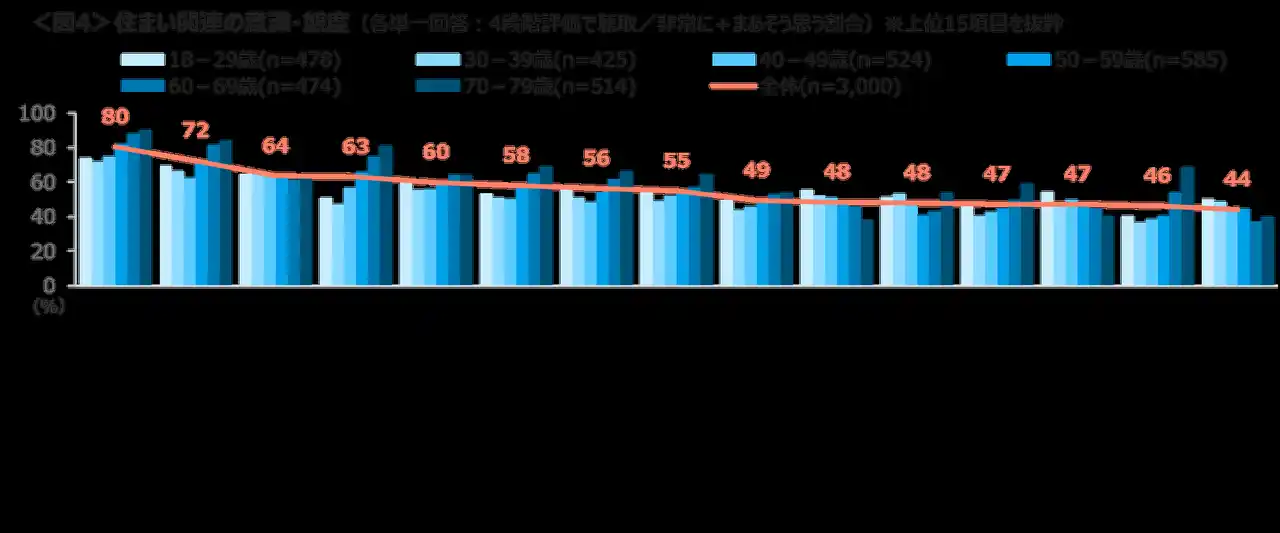 「免震対策をとっているなど、耐震性のある家に住みたい」は80%、「防犯や火災などに対するセキュリティシステムが完備した家に住みたい」72%がTOP2。次いで「部屋数が多くて家族がそれぞれプライバシーを保てる家に住みたい」「自分や家族の将来を考え、バリアフリーの住宅に住みたい」「同じ予算なら多少狭くても、通勤に便利で設備のいい家に住みたい」が6割台。多くの項目は年代が高くなるほど割合は増えるが、「草むしりが面倒で虫も気になるため、庭のない家に住みたい」「良質な賃貸住宅が増えれば、持ち家にはこだわらない」のみ年代が若いほど高い。<図4> |
