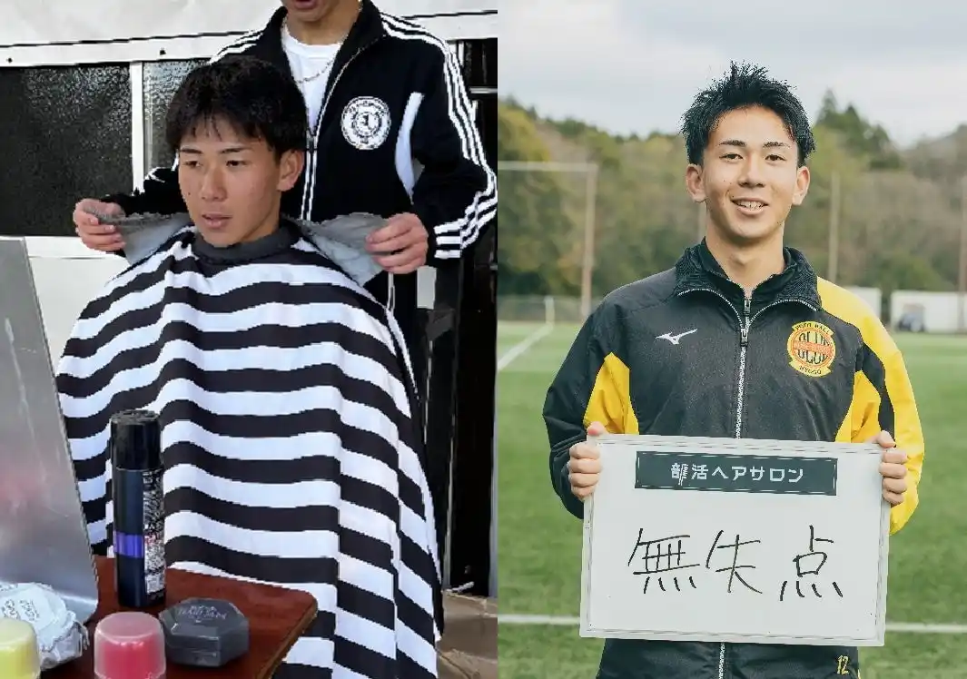 普段は髪を分けるくらいでスタイリング剤はあまり使わないけれど、今日はちゃんとセットしてもらって、視野が広いとプレーもしやすいと思いました。新しいスタイルで新鮮ですし、気持ちも気合も全国に向けて入ったかなと思います。全員でまずはしっかり一勝したいと思います。(キャプテン 今井凛太朗選手) |