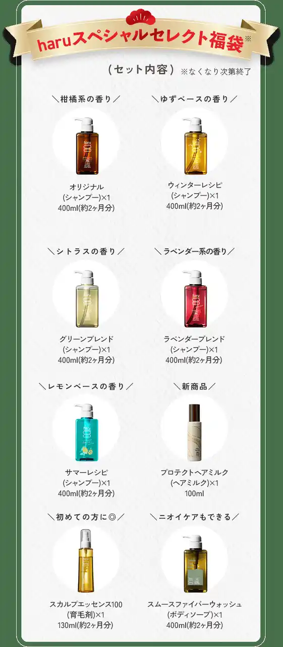 ・haruスペシャルセレクト福袋(※1) ・使い比べ5本シャンプーセット(※1) ・人気2種お試し福袋 |