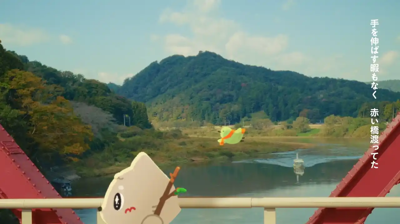 丸森町を象徴とする丸森橋を歩くねこがみとうぐいすP |