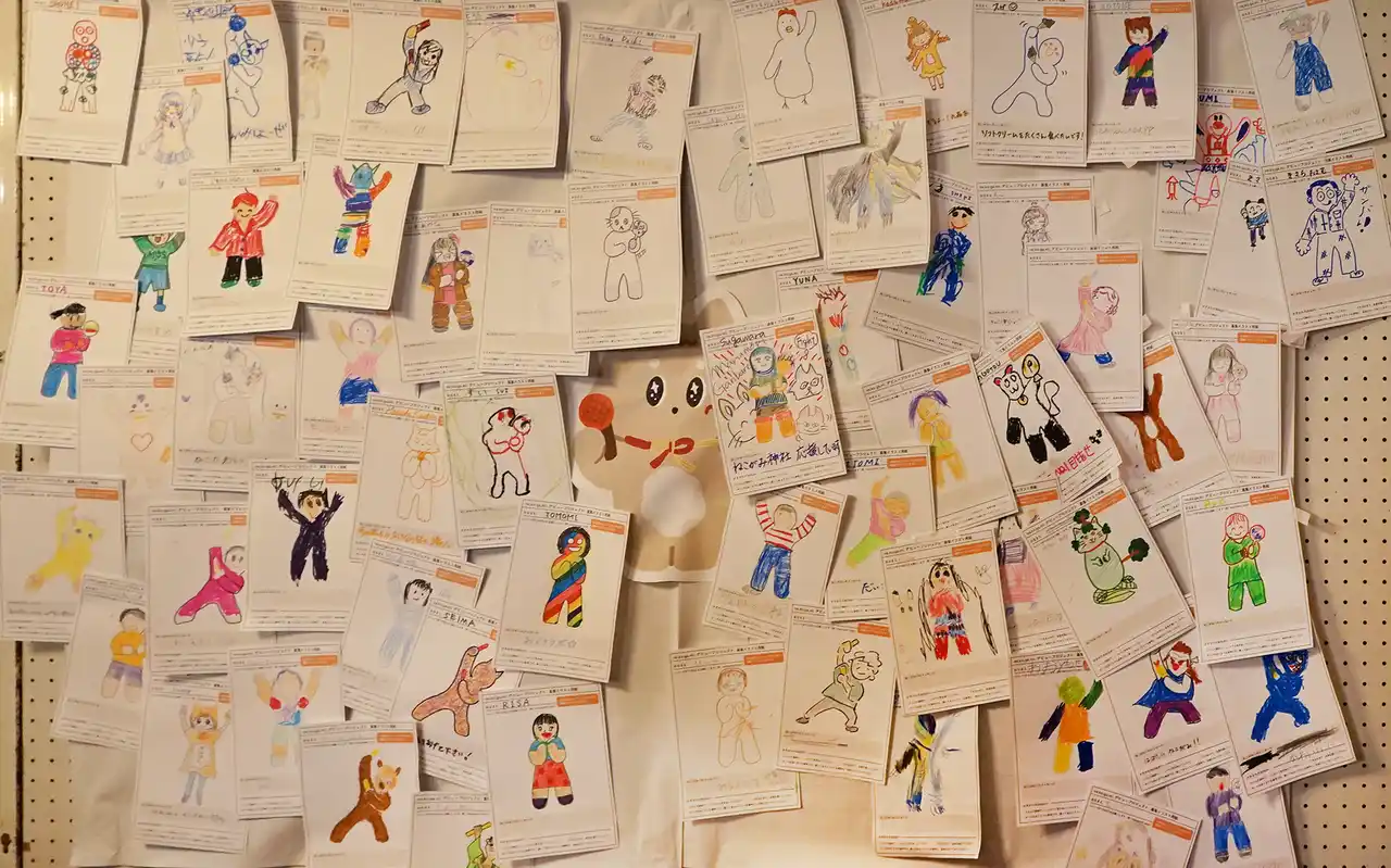 丸森町の夏祭り「齋理幻夜」のワークショップ参加者が描いた、ステージに立つねこがみを応援する観客イラスト |