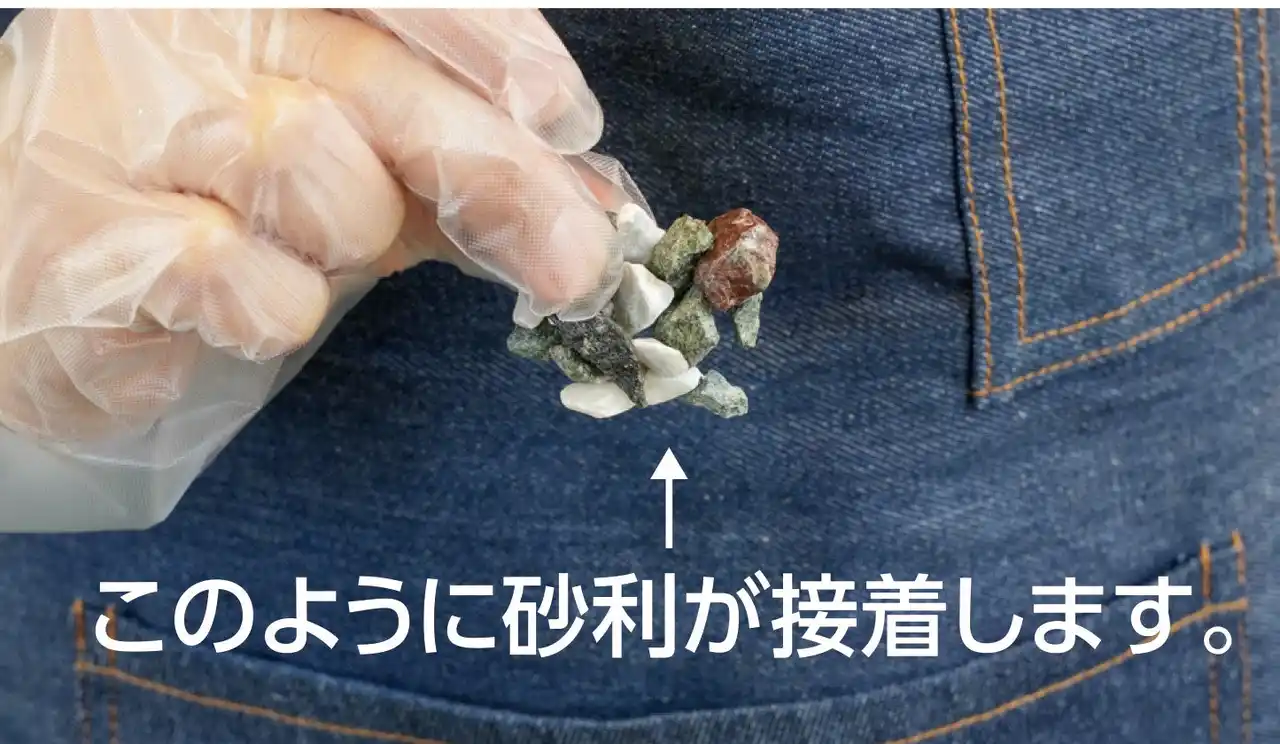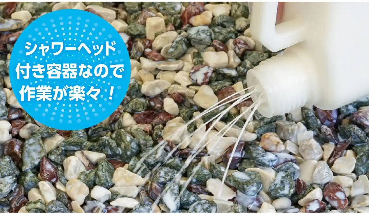 シャワーヘッド付き容器を採用しており、シャワー状に散布できるため、広範囲でも均一に施工が可能です。力を入れる必要がなく、誰でも簡単に扱える設計となっています。推奨小砂利サイズは9~15mmで、一般的な砂利に対応できます。施工後は透明クリアに仕上がるため、砂利本来の意匠性や色合いを損なうことなく、美しい景観をそのまま維持できます。 |