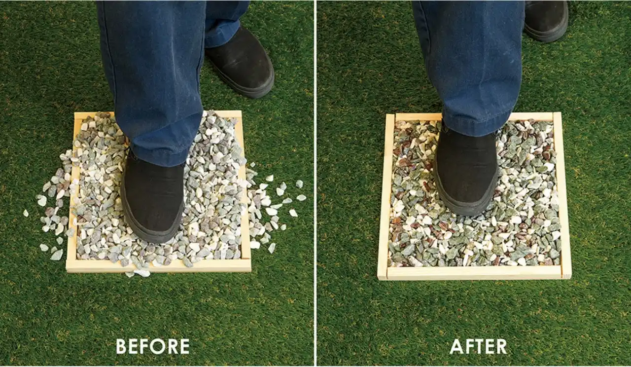 「砂利を固める水性接着剤」は、小砂利同士をしっかりと接着し、歩行や風雨による散乱を防止します。固められた砂利面は安定性が増し、落ち葉やゴミが表面に溜まっても簡単に掃き掃除ができるため、従来のように砂利の間に入り込んだ枯葉を一つひとつ取り除く必要がありません。 |