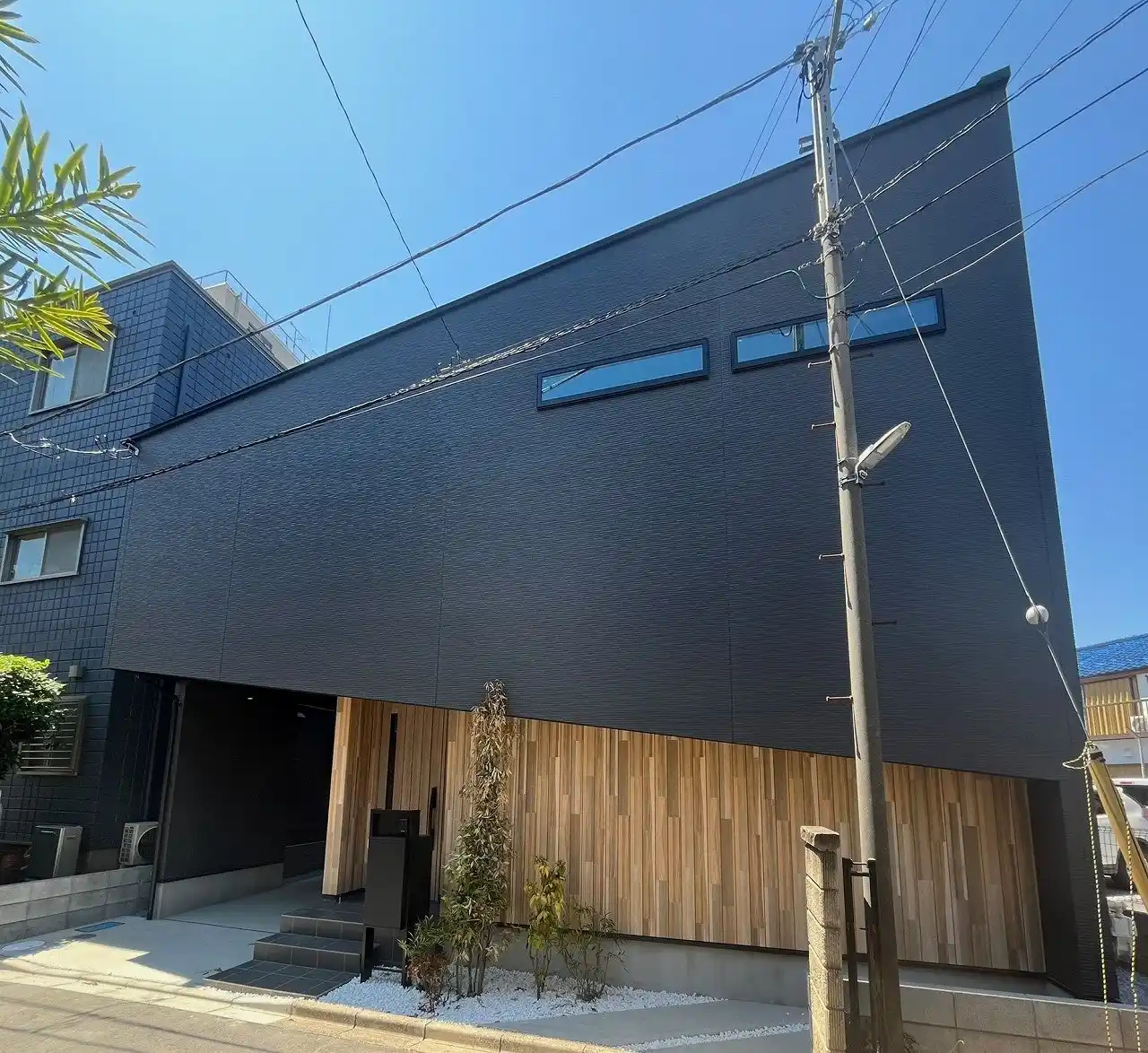デザインのポイントは、外壁材「トランディウッド」と「ルストナ」を組み合わせた立体感のあるファサードです。奥行きのあるバルコニーで道路側からの視線を遮りつつ、サッシを目立ちにくくすることで木目調を強調しました。さらに、セットバックしたバルコニー周りの構造体がアルファベットの「F」のような特徴的な形状を描いており、これにより生まれる陰影が、建物の奥行き感を表現することができました。また、デザインの意図としてコラム部分をあえて太く設計することで、バルコニーの腰壁部分との縦横比を視覚的に調整し、外観全体のバランスを考えました。 |