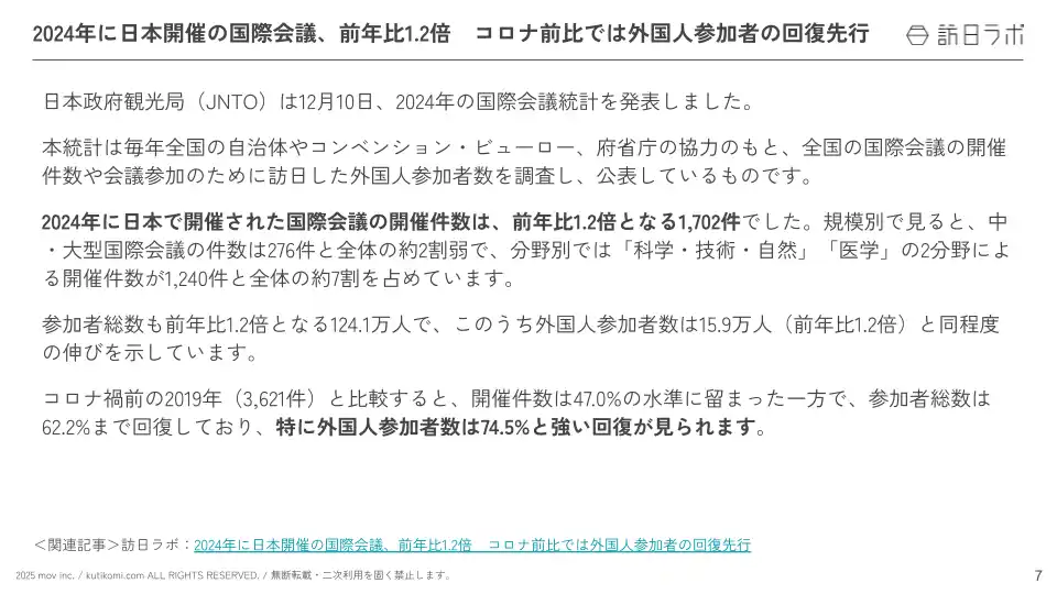 2024年に日本開催の国際会議、前年比1.2倍 コロナ前比では外国人参加者の回復先行 |