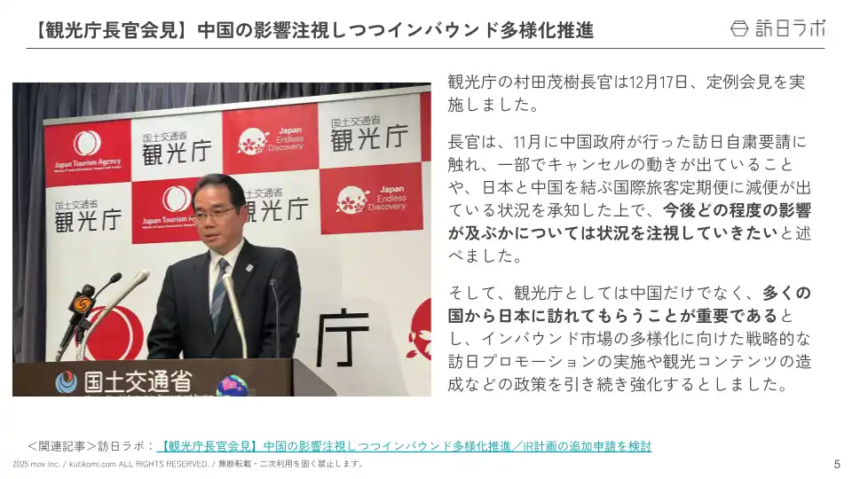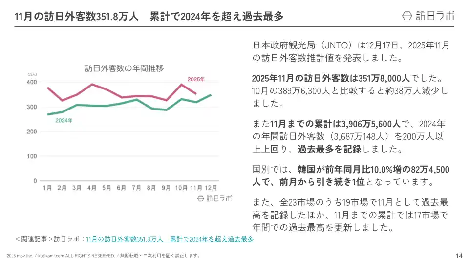 業界最大級のインバウンドビジネスメディア「訪日ラボ」及び 店舗向け集客一元化プラットフォーム「口コミコム」を運営する株式会社mov(代表取締役:渡邊 誠、本社:東京都渋谷区、以下mov)は、「インバウンドに関する最新トレンド・データ」「政府・自治体・企業などのインバウンド関連の取り組み」をはじめ、インバウンド対策に役立つニュースをまとめた「インバウンド情報まとめ【2025年12月後編】」を公開しました。 |