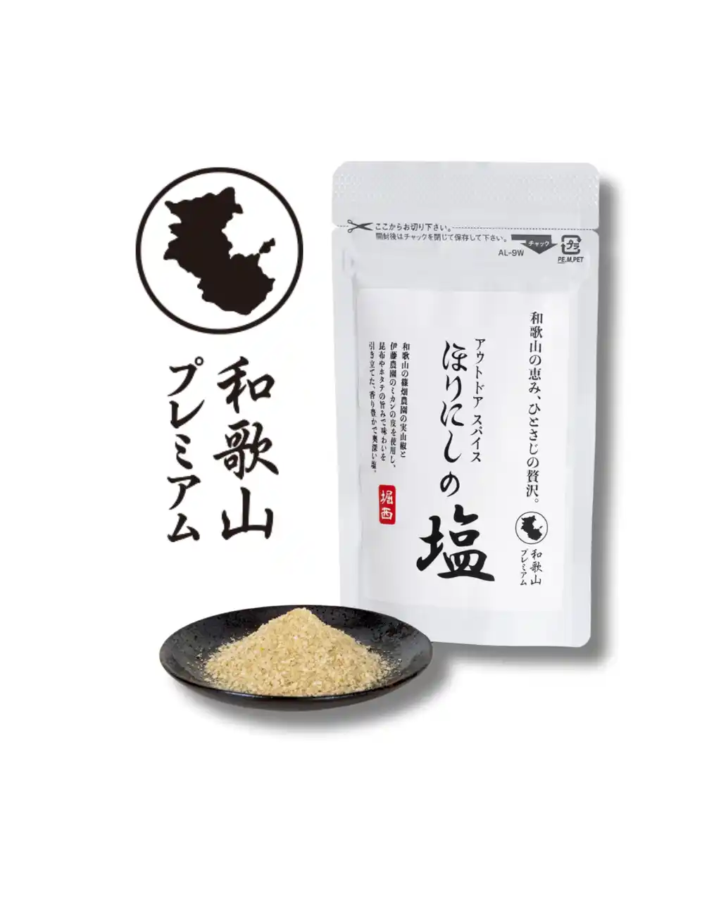 「アウトドアスパイス ほりにし」発祥の地である和歌山県は、温暖な気候に恵まれ、豊かでバラエティに富んだ食材にあふれています。人々の智恵、受け継がれてきた伝統、熱い想いから生まれた、和歌山ならではの味わいがたくさん。今回の新商品「アウトドアスパイス ほりにしの塩」では”和歌山プレミアム”と題して、篠畑農園の実山椒と伊藤農園のミカンの皮を使用。さらに昆布やホタテの旨みで味わいを引き立てた香り豊かで奥深い風味が特徴です。 |