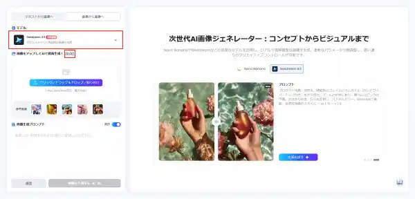 「画像から画像へ」機能では、Nano Banana ProとSeedream 4.5の両モデルで複数参照画像生成に対応。複数の参考画像を組み合わせることで、より複雑で洗練された構図や色調の画像を素早く生成でき、クリエイターの発想力を最大限に活かせます。