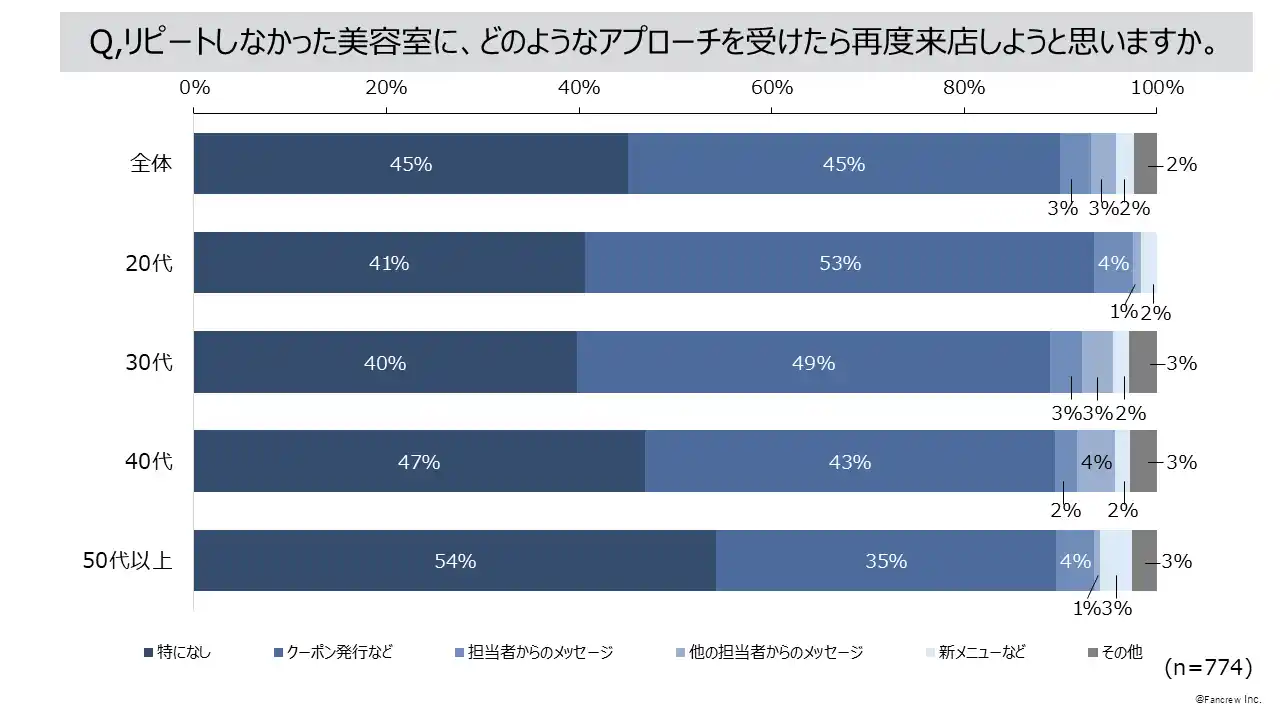 過去にリピートしなかった店舗から、その後「再来店を促すような施策を「受けなかった」と回答した人は、美容室で69%、整骨院では77%でした。ただし、リピートしなかった店舗から「クーポン発行など」のアプローチがあれば再来店しようと思うと回答したのは45%を占めました。 |
