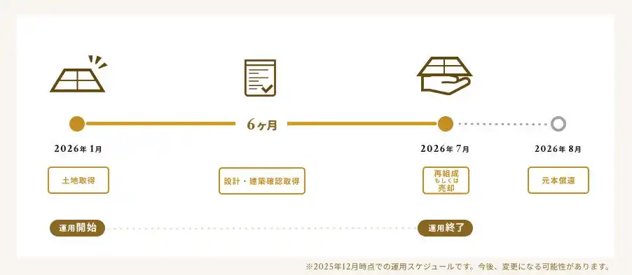 本ファンドでは、運用期間中に対象地において上記複合型ホームの設計および建築確認取得を行います。設計完了および建築確認取得後、新ファンドを組成し(以下「再組成ファンド」)、当該物件を再組成ファンドへ組み入れたうえで償還を行う予定です。第三者へ売却したうえで、償還を行う可能性もあります。 |