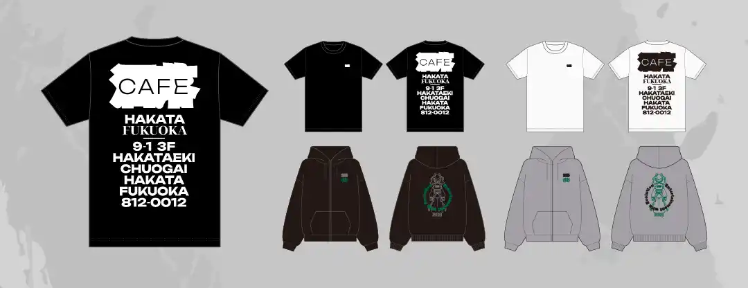 | 洒落(博多ver)のおりT作ったよTシャツは新ロゴを手掛けたNKCN氏、オリジナルパーカーは独創的な世界観で支持を集めるイラストレーター/グラフィックデザイナーとして活動するスドウ創太氏(X@sota_96)がそれぞれ制作を担当。両アイテムは店頭での販売も行い、カフェの枠を超えたストリートカルチャーを提案します。 | ||||