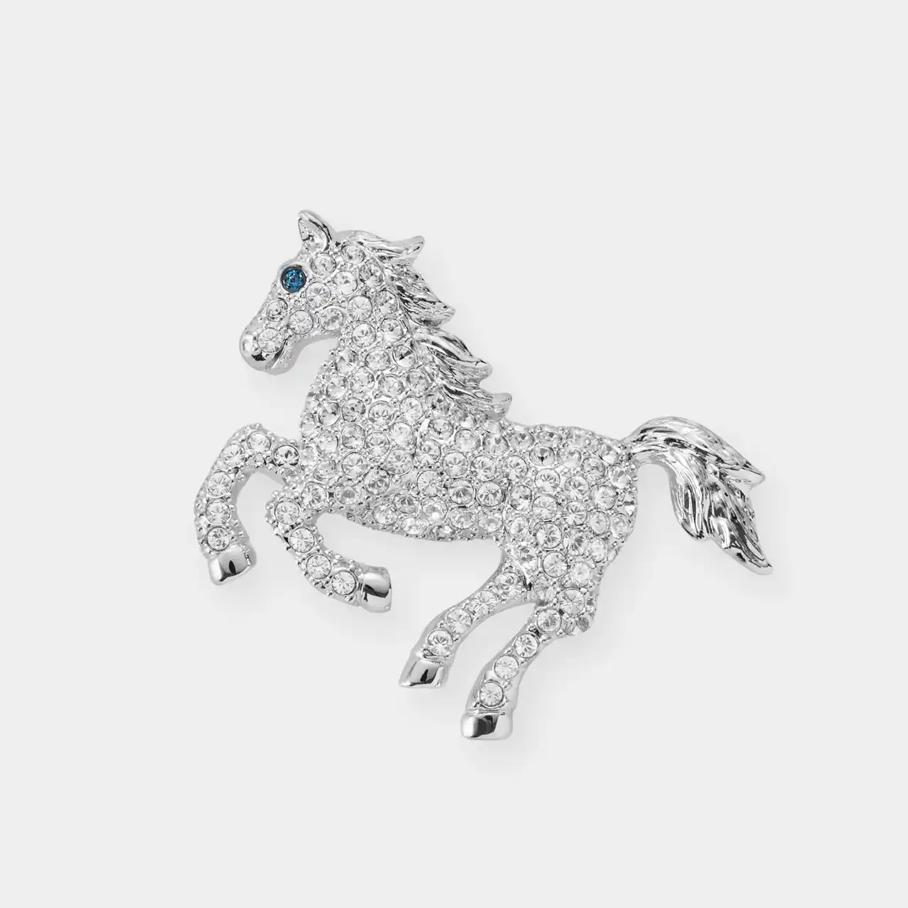 たてがみや尻尾の毛並みを生き生きとなびかせ力強く駆け回る、躍動感あふれる馬の姿を表現したブローチ。 瞳には気品あるブルーのカットガラスをセッティング、ボディーにはクリスタルカラーのカットガラスを贅沢に散りばめました。 |