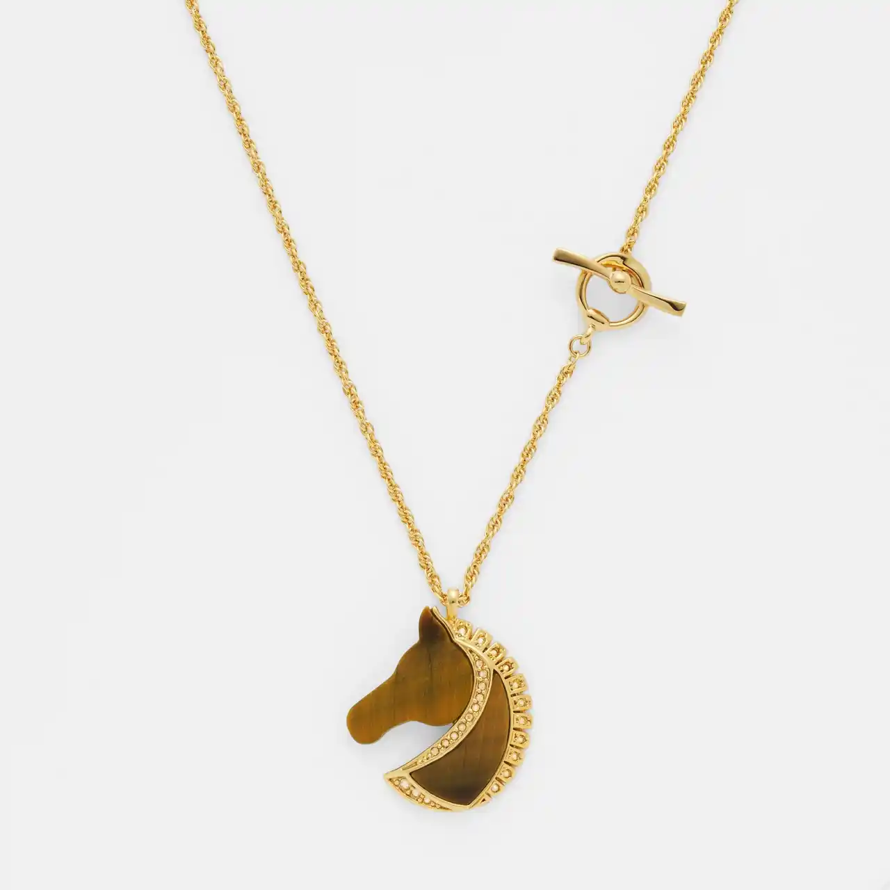 馬の優美なフォルムをデザインしたネックレス。 悠久の時の中で大地に育まれたタイガーアイは、光の反射で浮かび上がる唯一無二の縞模様が魅力的。 |