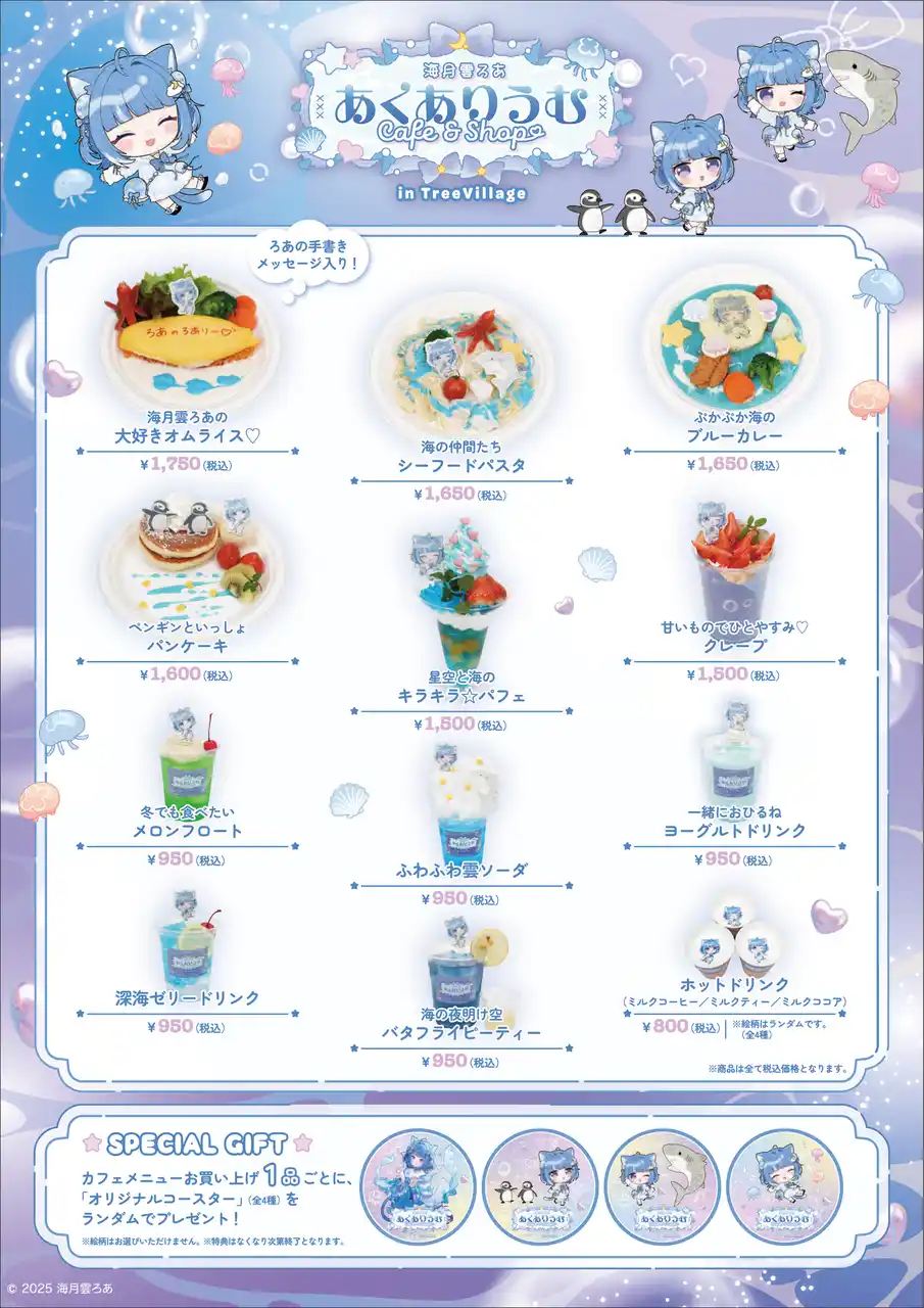 『海月雲ろあ あくありうむ Cafe&Shop in TreeVillage』関連メニューをエンタメショップ ツリービレッジにてご飲食1品ごとにコースター(全4種よりランダムで1枚配布)をプレゼントいたします。 |