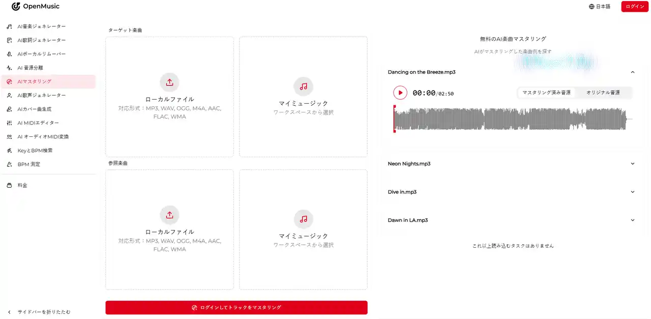 レオ氏の言葉は、私たちが目指していた未来そのものでした。彼が手に入れたのは、単なる時短ツールではありません。本来注ぐべき情熱を、作品そのものに100%注ぎ込めるという「自由」です。歌詞がメロディになり、荒削りな音がAIマスタリングによって磨き上げられ、スタジオ品質となって世界へ羽ばたいていく。そのプロセスに、もはや専門知識の壁は存在しません。 |