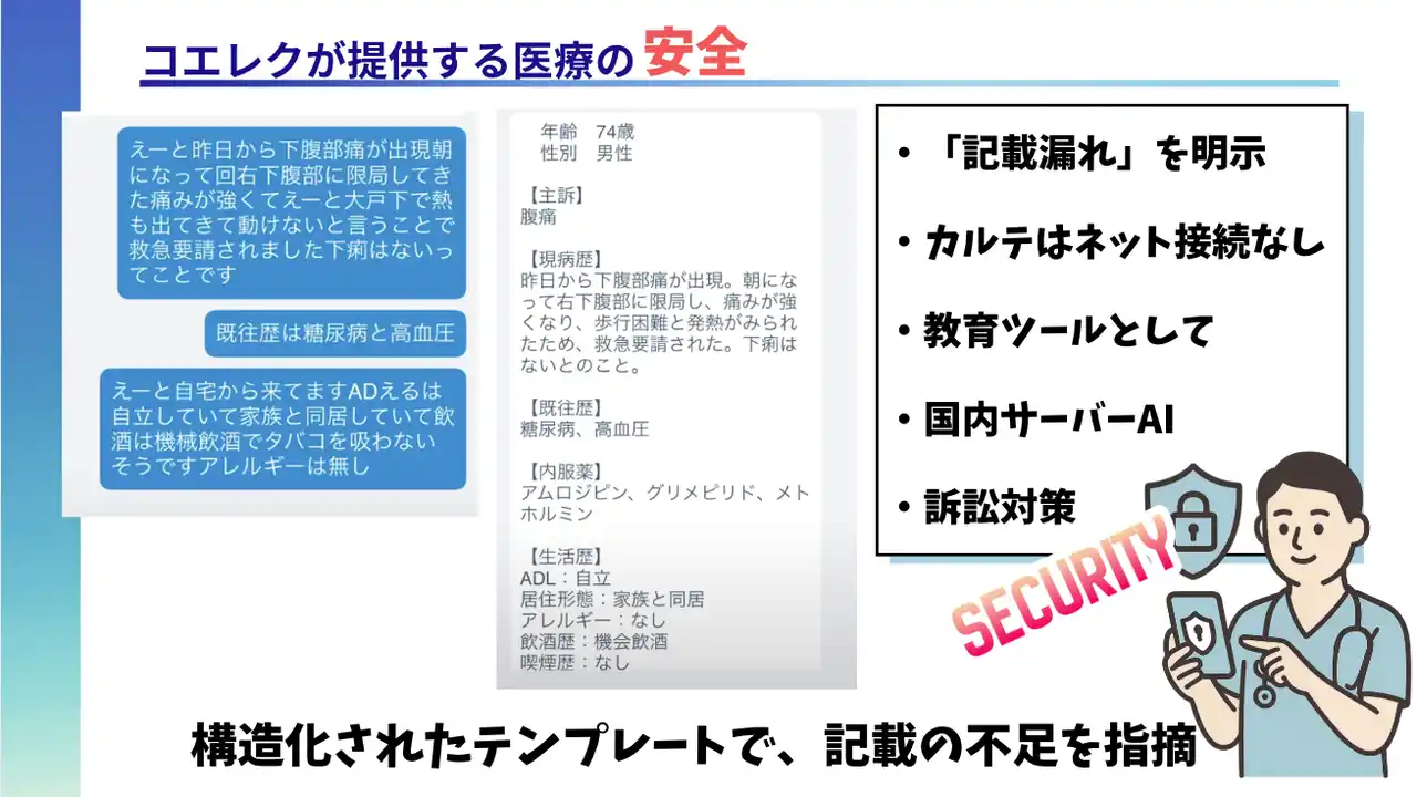 コエレクは、医療従事者の記録業務を劇的に効率化するAI音声入力アプリケーションです。現役救急医である代表の平山が、札幌徳洲会病院の救急現場で20年間抱えてきた「記録業務に追われ、本来の診療に集中できない」という課題を解決するために開発しました。 |