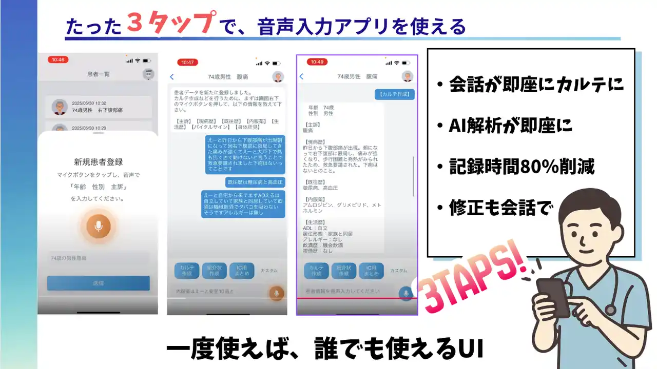 従来25分かかっていた記録作業が、わずか3分程度に短縮されます。これにより、医師は本来の診療や患者とのコミュニケーションに時間を使えるようになります。 |