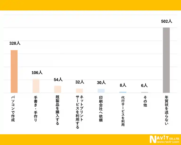 | こちらのアンケートも複数回答にていただいております。年賀状の作成方法についてのアンケートでは、「パソコンで作成」という人が最も多く328人、2番目は「手書き・手作り」と回答された人が106人という結果になりました。 | |||