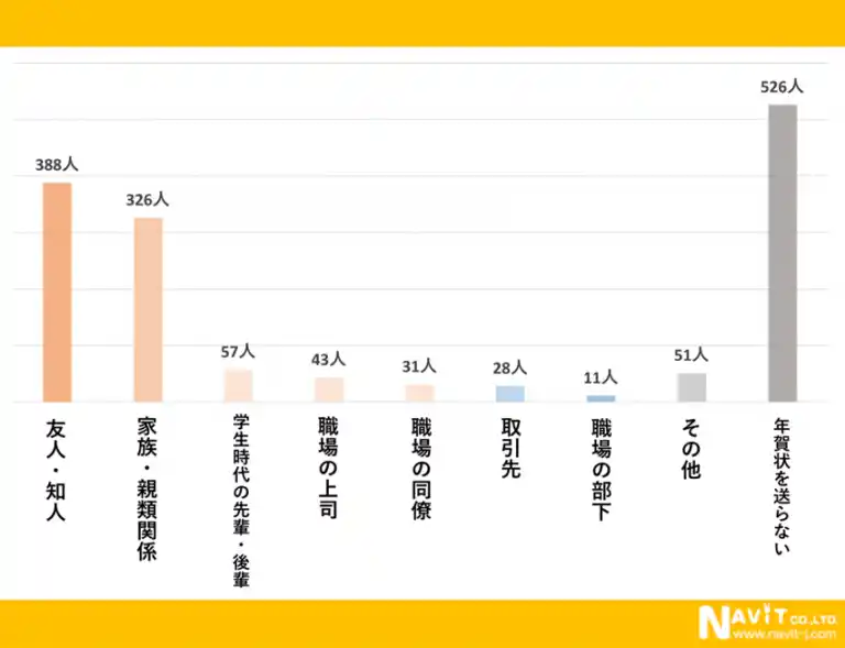 | こちらは複数回答のアンケートです。年賀状を送る相手についてのアンケートでは「知人・友人」と答えた人が388人で最も多く、次に多かったのが「家族・親類関係」で326人という結果になりました。 | |||