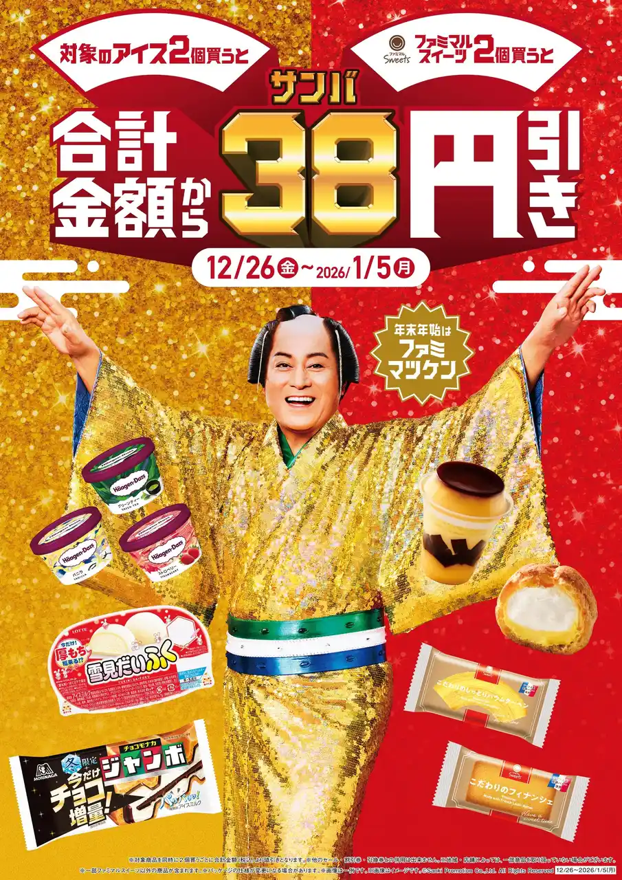 松平健さんのオリジナルグッズに続き、2025年12月26日(金)から2026年1月5日(月)までファミマのアプリ「ファミペイ」で総額約1億円相当のクーポン・ポイントがもらえる「ファミペイジャンボ」を開催いたします。さらに、同期間で対象のスイーツやアイスを2個同時に買うとサンバにちなんで合計金額から38円引きになる「38円(サンバ)引き」も実施いたします。年末年始にファミリーマートをご利用される皆さまが、明るい気持ちになるようなおトクなキャンペーンをご用意しております。 |