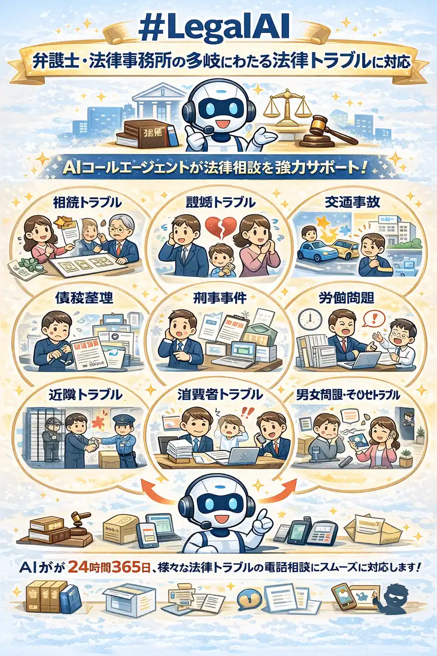 ■ 「AIコールエージェント」の圧倒的な万能性 本サービスは、単なる自動応答ではありません。多岐にわたる法律分野を理解し、個別具体的な対応が可能です。 |