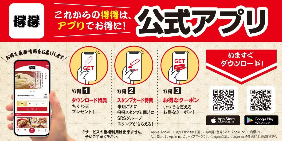 | 株式会社家族亭(本社:大阪府大阪市、代表取締役執行役員社長:坪山憲司)が運営する「得得(とくとく)」は、「おいしいうどんを、気軽にお腹いっぱい召し上がっていただきたい」という想いのもと、毎日店舗で丁寧にだしを取り、茹でたてのうどんを提供することにこだわっているうどんチェーンです。うどん本来の美味しさを大切にしているからこそ、「うどん3玉まで同一価格」という得得ならではのサービスを実現しています。 | |||||||||||||