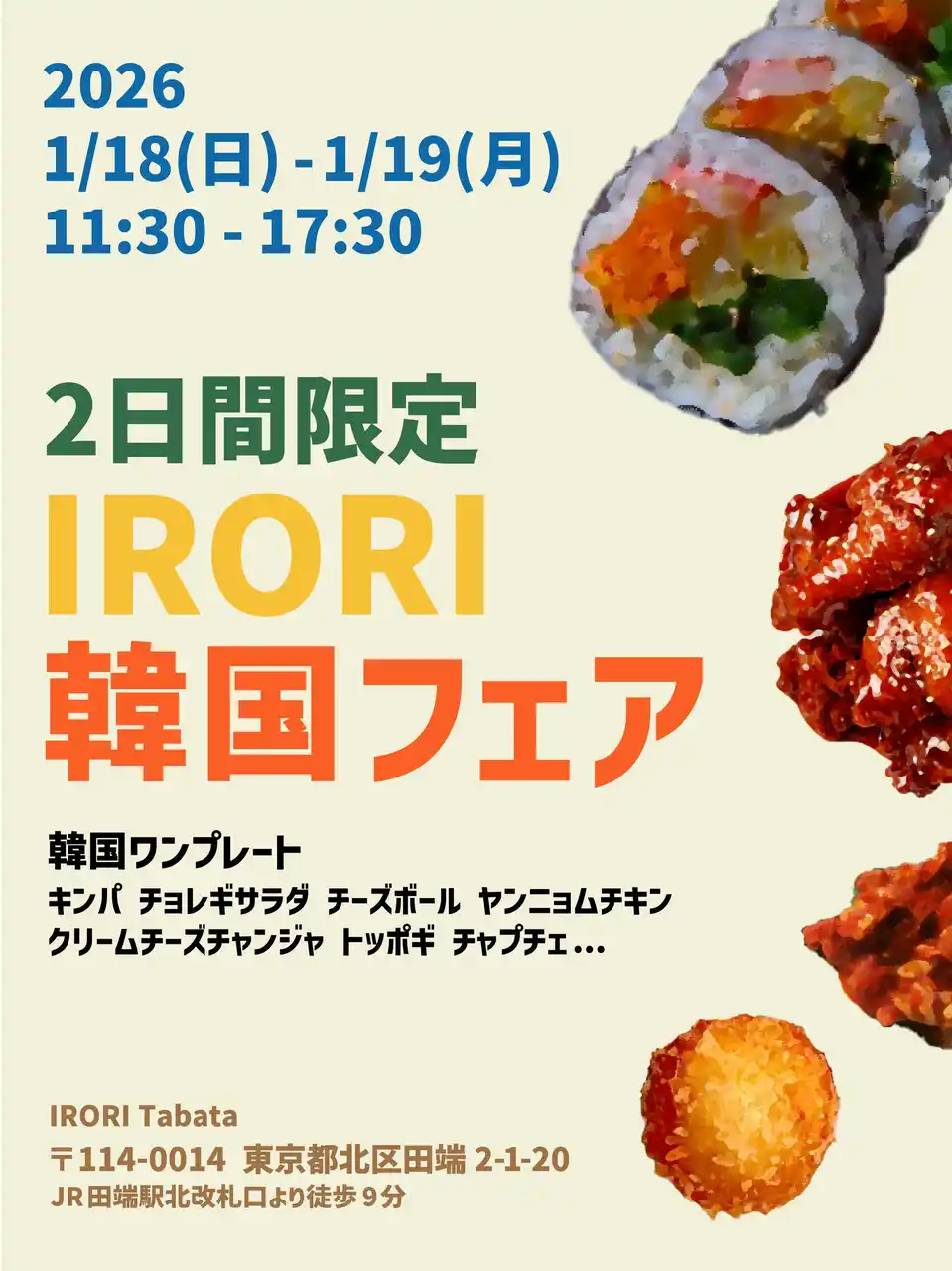 | 東京・北区田端で2025年11月18日にオープンした「IRORI Tabata」(所在地:東京都北区、代表:吉田奈未)は、2026年1月18日(日)・19日(月)の2日間限定で、店内イベント「韓国フェア」を開催します。 | |||||||||||||||||||