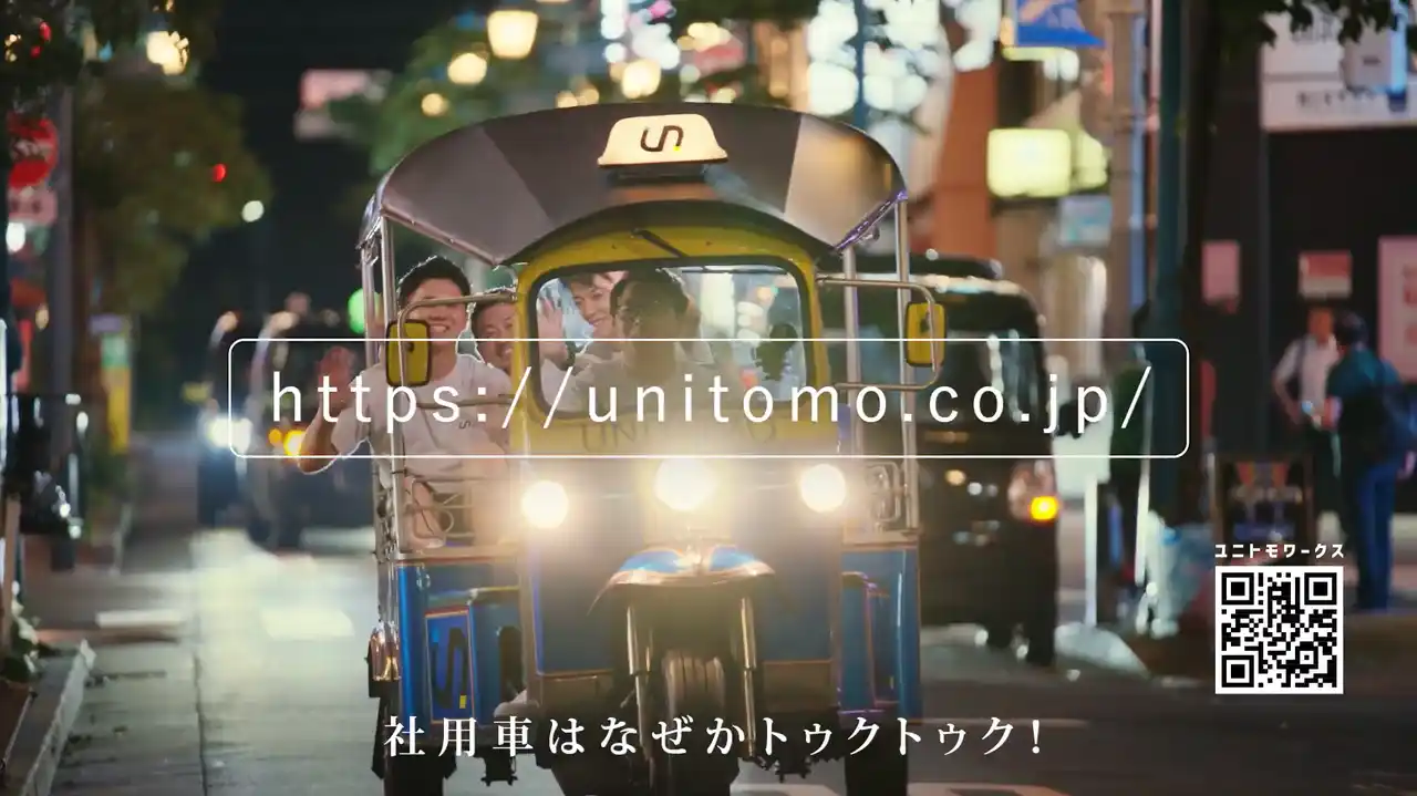 本CMは、現在都内のタクシー配車サービス「S.RIDE」搭載のタクシーで放映中のCMと同一映像となり、はなわさんが作詞・作曲を手がけたオリジナル楽曲「ユニトモワークスのうた」を使用し、当社が大切にしている「愛」「唯一無二」という価値観を、ユーモアと温かさをもって表現しています。 |