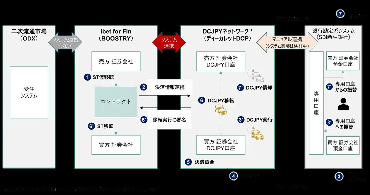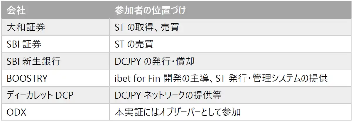 株式会社SBI証券(代表取締役社長:高村 正人、以下「SBI証券」)、大和証券株式会社(代表取締役社長:荻野 明彦、以下「大和証券」)、株式会社SBI新生銀行(代表取締役社長:川島 克哉、以下「SBI新生銀行」)、株式会社BOOSTRY(代表取締役社長:平井 数磨、以下「BOOSTRY」)、大阪デジタルエクスチェンジ株式会社(代表取締役社長:朏 仁雄、以下「ODX」)、株式会社ディーカレットDCP(代表取締役会長兼社長執行役員CEO:村林