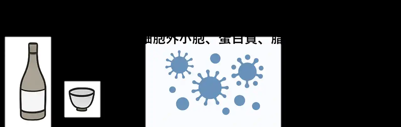 リジェネソームは、細胞外小胞を基軸とした長寿科学・宇宙医学研究を推進してきました。本研究で注目している「日本酒由来ナノ粒子」は、清酒に特徴的な並行副発酵のプロセスで生成される成分で、独自のナノ粒子の集合が形成されていると考えています。 |