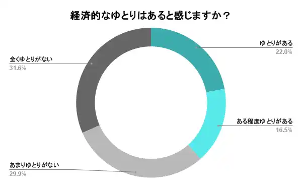 「経済的なゆとりはあると感じますか?」という設問に対し、「ゆとりがある」22.0%、「ある程度ゆとりがある」16.5%となり、経済的なゆとりがあると回答した割合は合計38.5%であった。 |