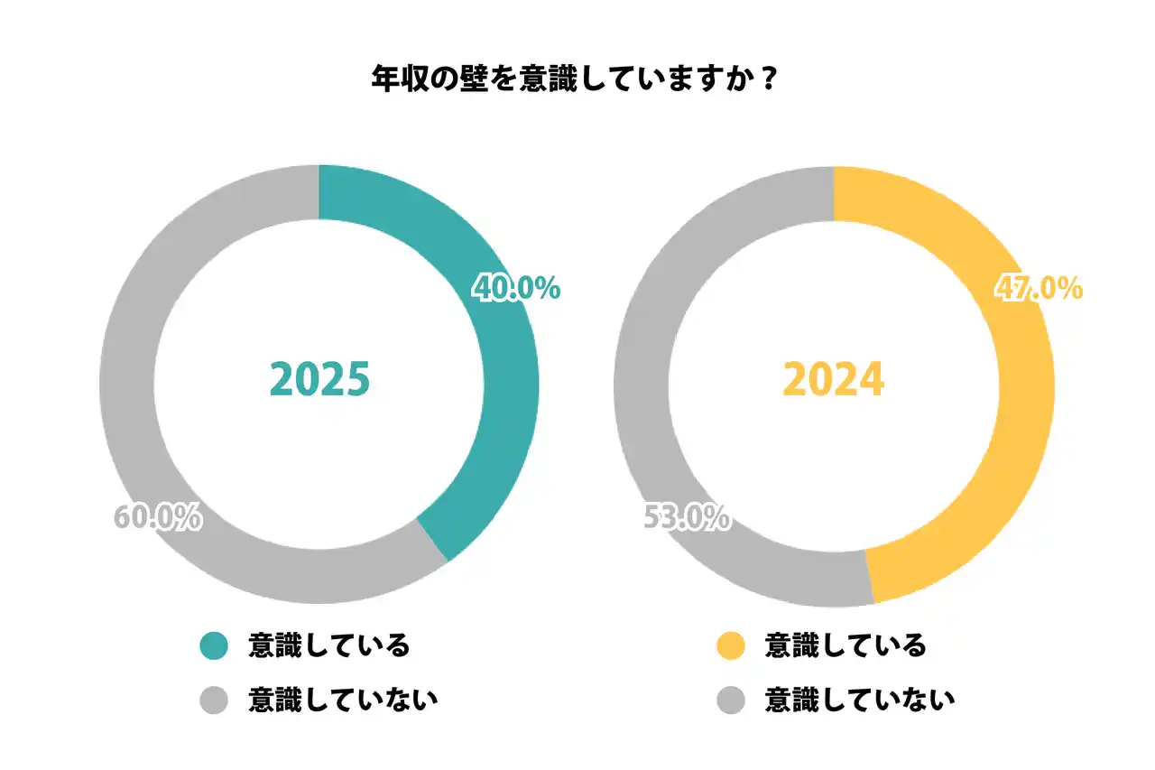 年収の壁に対する意識については、「意識している」と回答した割合が2024年の47%から2025年は40%へと低下し、「意識していない」層が6割を占める結果となった。 |